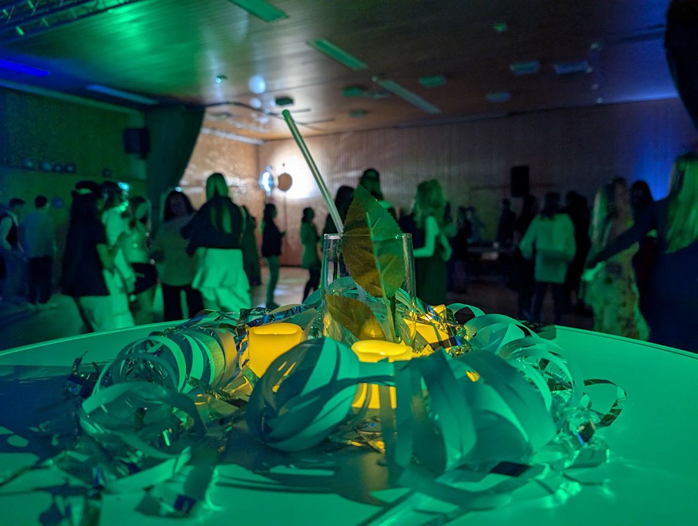 Die Mehrzweckhalle war festlich dekoriert, bunte Discolichter sorgten für Stimmung und ein DJ legte die passende Musik auf. Am Eingang wurden die Tickets kontrolliert, die man in den Wochen zuvor in der Aula kaufen konnte.