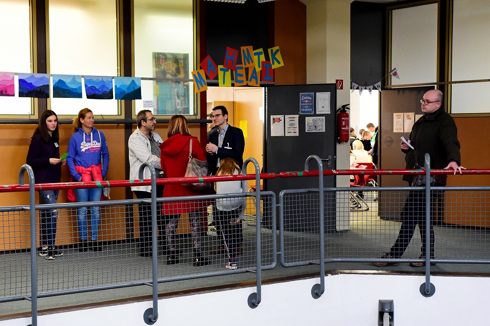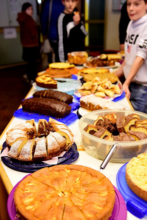 Während sich die potentiellen Fünftklässler an den Aufgaben der Fachbereiche versuchten, hatten die Eltern die Möglichkeit mit den Lehrern und Lehrerinnen der Real- und Werkrealschule ins Gespräch zu kommen und Fragen zu den unterschiedlichen Bildungsmöglichkeiten zu stellen. Besonders das Angebot der bilingualen Englischklasse der Abteilung Realschule, welches nun schon seit drei Jahren besteht, traf bei den Eltern auf großes Interesse. Im Foyer konnten die Eltern auch mit den beiden Schulsozialarbeitern ins Gespräch kommen. Die Klasse 7a bewirtete die zahlreichen Gäste mit Kaffee und einer großen Auswahl an Kuchen.