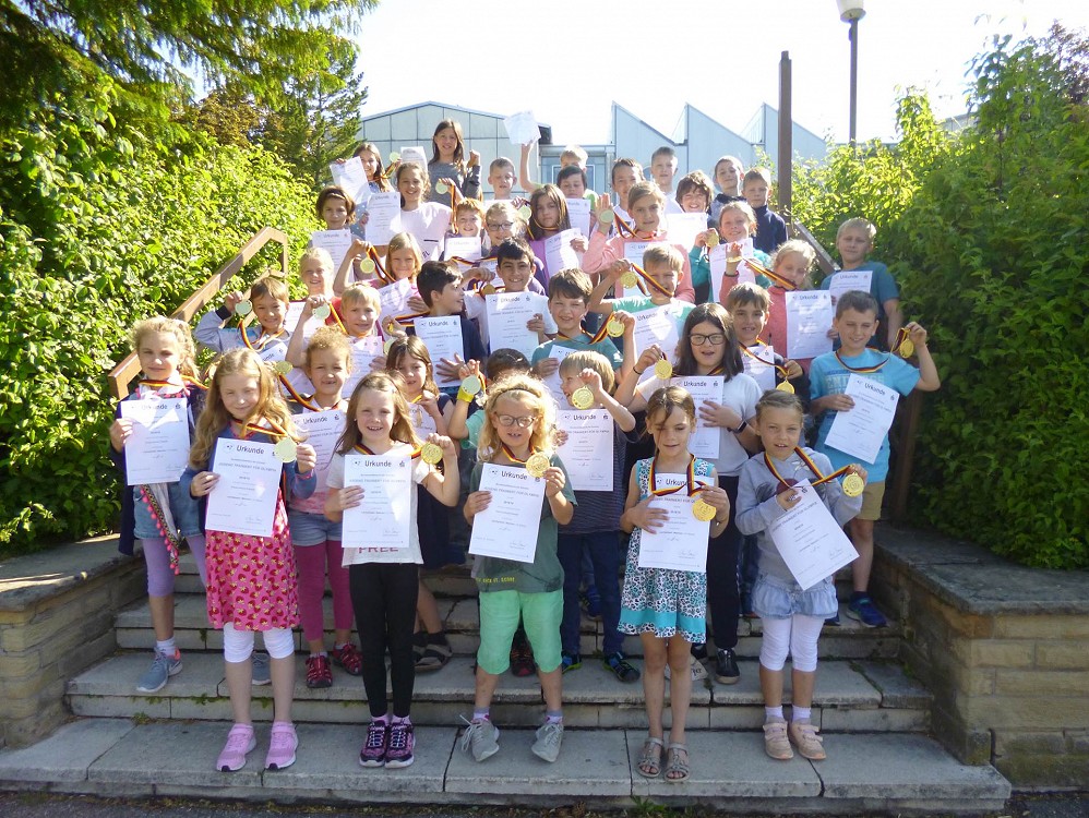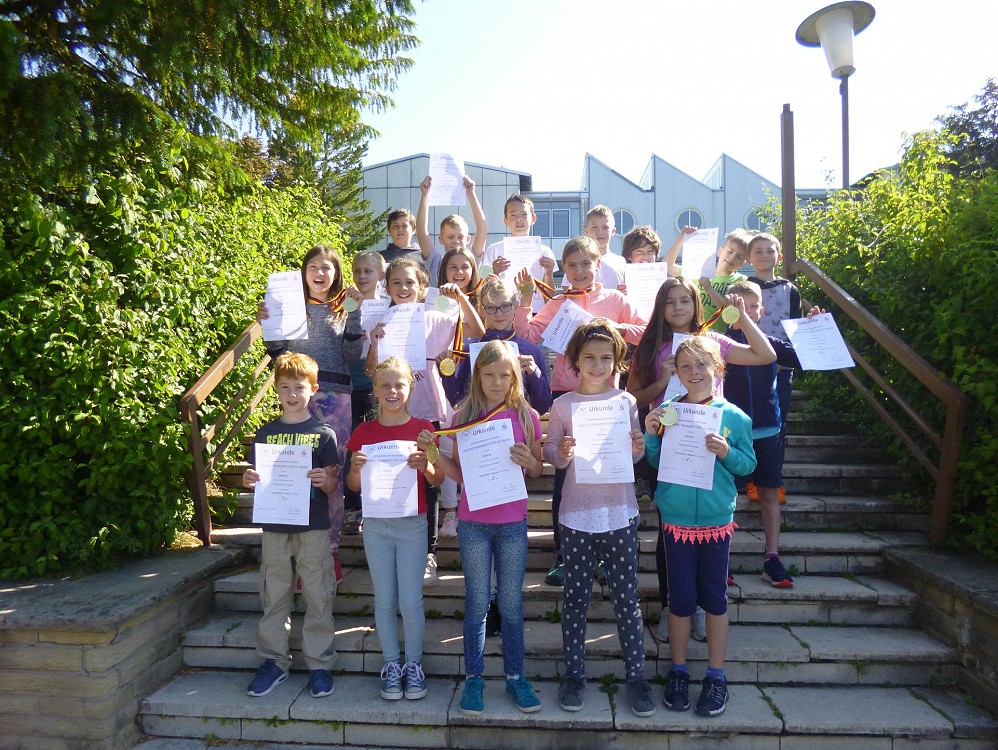 Bei optimalen Bedingungen waren insgesamt 45 Mannschaften aus dem Landkreis Karlsruhe am Start und wetteiferten in den Disziplinen Lauf, Wurf und Sprung nach dem seit einigen Jarhen geänderten Wettkampfmodus, welcher mehr den Mannschaftsgedanken in den Vordergrund stellt. Hierbei erkämpfte sich die Mädchenmannschaft der 4.Klassen den 1.Platz und qualifizierte sich somit für das RP-Finale in Karlsruhe. Darüber hinaus sicherten sie sich den 5.Platz beim Seilspringchampionat. Auch die Jungs waren mit Feuereifer dabei und erreichten einen hervorragenden 9.Platz.