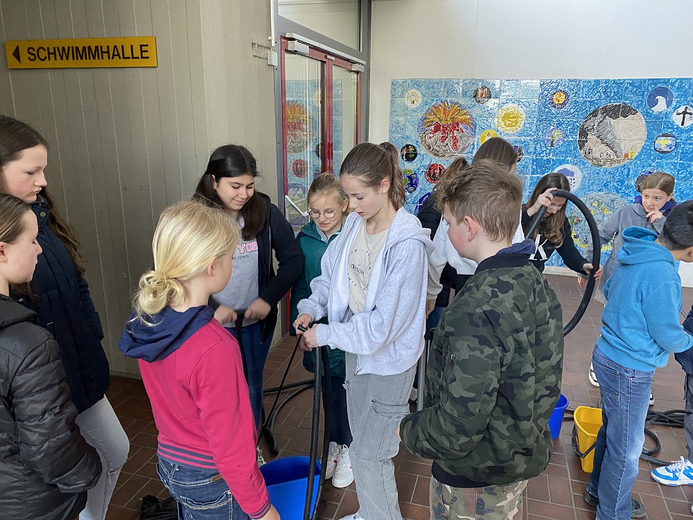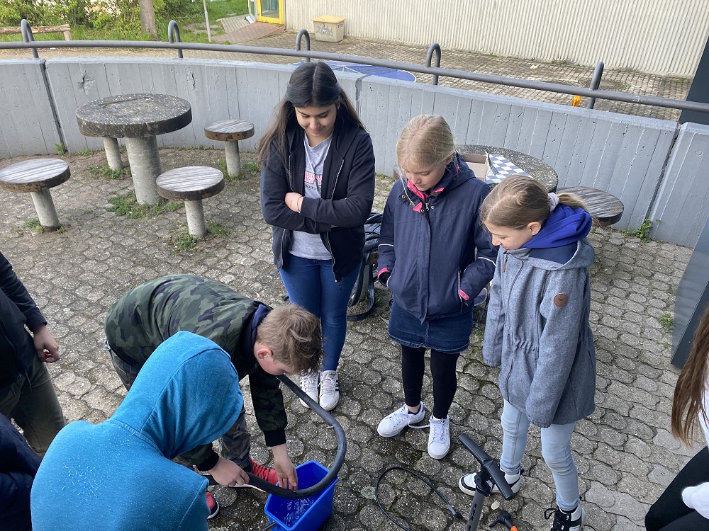 Eine Klasse war besonders beeindruckt, da ein übermotivierter Fahrradmentor zu viel Luft aufpumpte und den Schlauch zum Platzen brachte. Kann ja nicht schaden - so konnte man auch sehen, wie es nicht geht.