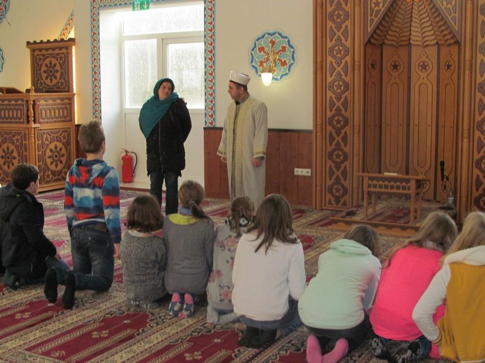 Fremdes muss man kennenlernen, damit es einem keine Angst macht. Aus diesem Grund besuchte die katholische Religionsklasse 6b/c/d die Sultan Ahmet Camii, eine türkische Moschee in Bruchsal. Zuvor hatte sie sich mit dem Thema „Fremde“ und mit dem „Islam“ beschäftigt. Frau Altun, die Dialogbeauftragte der türkischen Gemeinde zeigte zusammen mit dem türkischen Religionsgelehrten den Schülerinnen und Schülern, was das Besondere einer Moschee ist: Eine Waschgelegenheit im Vorraum, keine Stühle und Bänke, dafür Teppichboden, den auch die Schüler und Schülerinnen nur ohne Schuhe betreten durften, keine Bilder an den Wänden, dafür aber wunderschöne Kalligraphien, eine Gebetsnische Richtung Mekka und eine Kanzel. Die Schüler und Schülerinnen stellten dazu viele Fragen. Manches blieb ihnen eher fremd, wie etwa der Gebetsruf des Imam, bei anderen Sachen wurden Ähnlichkeiten zu unserem Glauben entdeckt. So konnten alle die Gesten des Gebetes nachvollziehen und machen sie dann auch mit; mit Erstaunen entdeckten einige Schülerinnen sogar so etwas wie einen Rosenkranz, die Gebetskette im Islam.