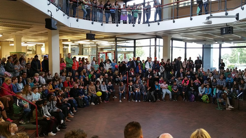 Während die Kinder ihren an der jeweiligen Farbe ihres Luftballons erkennbaren Lehrern in die Klassenzimmer folgten, erhielten ihre Eltern in der Aula weitere Informationen und hatten bei den in der Aula angebotenen Speisen und Getränken noch Gelegenheit, miteinander ins Gespräch zu kommen.