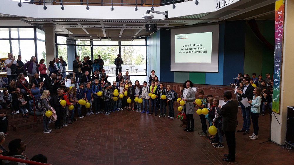 Auch in diesem Schuljahr wurden die neuen 5. Klässler wieder mit einer herzlichen und liebevoll gestalteten Einschulungsfeier in der Aula des Schulverbundes begrüßt. Die Jungen und Mädchen durften zusammen mit den sie begleitenden Eltern und Verwandten ein abwechslungsreiches und fröhliches Programm, welches von den Schülerinnen und Schülern der 6. Klassen durchgeführt wurde, erleben. Aufgeteilt wurden die neuen Schüler/innen in 3 Realschulzüge sowie eine Werkrealschulklasse. Dazu hatten sie bereits in den Sommerferien unterschiedlich eingefärbte Luftballone erhalten, die ihre zukünftige Klasse symbolisierten. Künftig werden sie nun den in diesem Schuljahr startenden neuen Bildungsplan mit Leben erfüllen und die spannende Zeit des Neubeginns an ihrer Schule selbst erfahren dürfen.