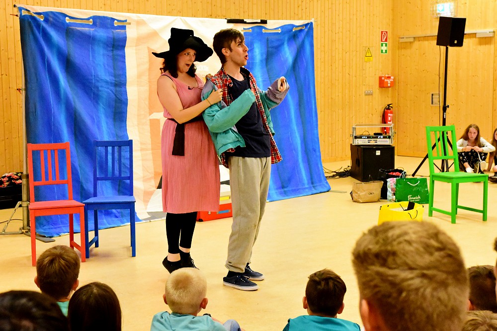 Zwei englische Theaterstücke wurden am Dienstag, 05. Juni in der Mehrzweckhalle des Schulzentrums präsentiert. So hatten unsere Schülerinnen und Schüler die Gelegenheit ihre Fremdsprachenkenntnisse anzuwenden. Eine Schauspielerin und ein Schauspieler des englischen Phoenix Theatre begeisterten ihr Publikum mit ihrer lustigen Vorstellung, bei der auch unsere Schüler einbezogen wurden. Für die Klassenstufen 5 und 6 ging es in „Minnie & Friends“ um die Themen Identität und Selbstbewusstsein mit der musikalischen Botschaft „Be who you are!“. „New Beginnings“ nahm die Schülerinnen und Schüler der 7. und 8. Klassen mit auf eine spannende Reise nach Amerika – von der Vergangenheit bis in die Gegenwart. Nach den Vorführungen durften Fragen an die Schauspieler gestellt werden. So macht Englisch Spaß!