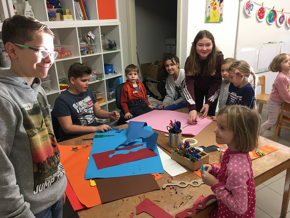 Kindergarten St. Michael. Bevor wir auf die Kinder getroffen sind mussten wir alles noch aufbauen und uns vorbereiten. Als sie kamen teilten sie sich in kleine Gruppen auf. Wir zum Beispiel waren die Backgruppe, es gab aber auch die Sportgruppe und die Bastelgruppe.
