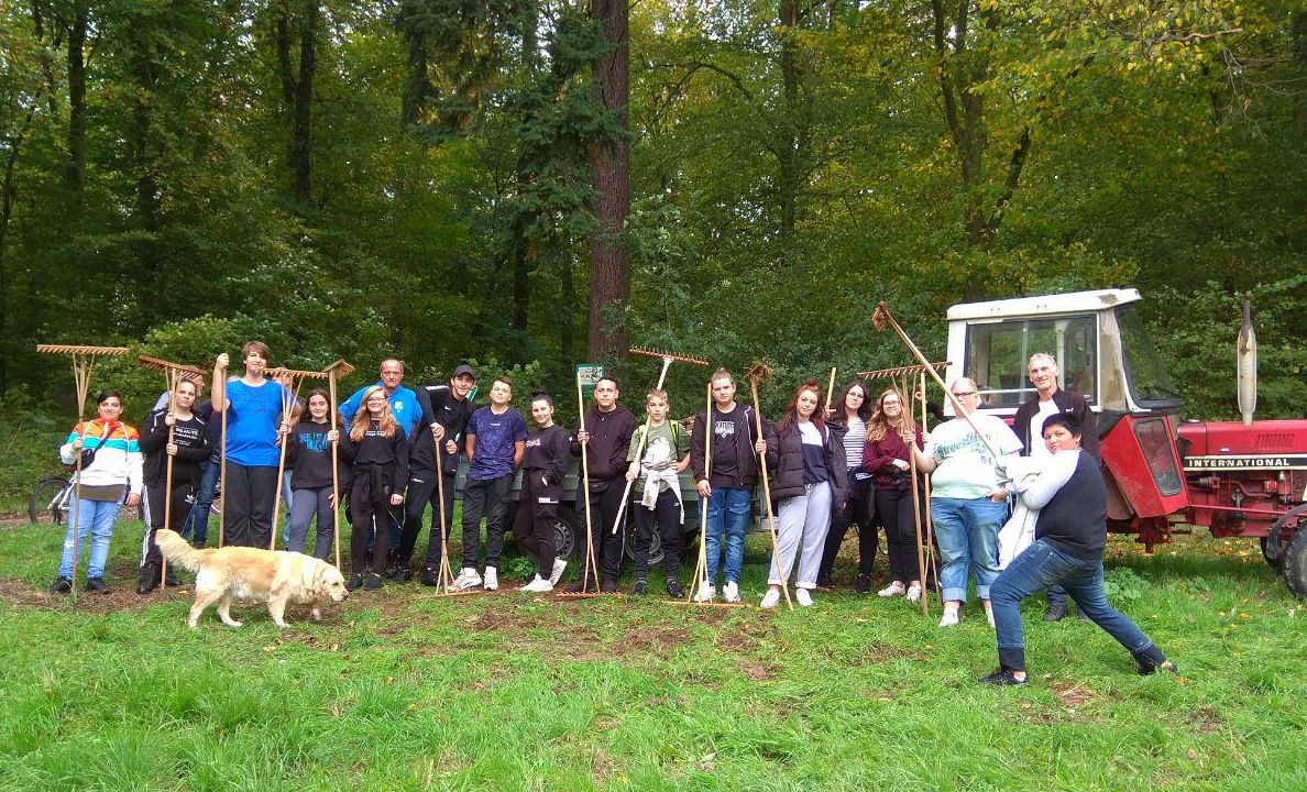 Alle Jahre wieder steht im Herbst die Pflege der Orchideenwiesen im Naturschutzgebiet „Beim Roten Kreuz“ in Zeutern an. Die Klassen 9e und 9f der Abteilung Werkrealschule des Alfred-Delp-Schulzentrums mit ihren Lehrern Markus Lichter und Stefan Greulich gingen am Freitag, 18.10.2019 auf den Hamberg-Terrassen an die Arbeit und das Wetter-Timing war perfekt: es regnete erst in Strömen, nachdem alles erfolgreich beendet war.