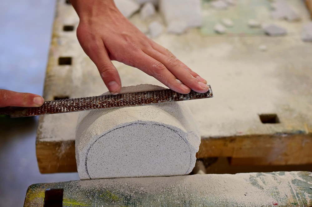 Die Klasse 9c, die an diesem Morgen von ihrer Klassenlehrerin, Frau Seitz, und ihrer Kunstlehrerin, Frau Large, begleitet worden war, wurde in zwei Gruppen aufgeteilt. Die Jungen entschieden sich alle dafür, erstmals mit dem Werkstoff Ytong zu arbeiten, während die Mädchen den Werkstoff Speckstein kennenlernen durften. Beide Gruppen wurden von erfahrenen Dozentinnen angeleitet. Zu Beginn ging es zunächst darum, den Werkstoff kennenzulernen. Im Bereich Speckstein sollten kleine Schmuckstücke in Form von Anhängern entstehen. Durch Feilen, Sägen und Bohren entstanden viele schöne Schmuckstücke. Im zweiten Schritt ging es darum, aus größeren Steinen, Tiere entstehen zu lassen. Diese Aufgabe erforderte nicht nur handwerkliches Geschick, sondern auch Fantasie und Kreativität. Die Jungen bekamen in der gleichen Zeit die Aufgabe, aus einem Ytong-Block ein Kunstwerk zu schaffen. Hierzu wurde zunächst eine Zeichnung angefertigt. Dabei wurde räumliches Vorstellungsvermögen verlangt, da ein plastisches Kunstwerk von allen Seiten gut aussehen muss. Die Jugendlichen entschieden sich beinahe mehrheitlich für die Herstellung eines praktischen Aschenbechers. Mit Eifer ging es auch hier ans Feilen und Sägen. Auch mit Hammer und Meißel wurde gearbeitet. Nach zweistündiger Arbeit waren aus den quaderförmigen Ytong-Klötzen bereits wohlgeformte Aschenbecher entstanden, die nun noch mit Schmirgelpapier einen Feinschliff bekamen.