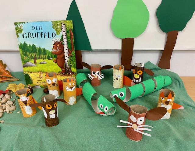 In der Woche vom 13.10.25 bis 17.10.25 drehte sich in der Grundchulförderklasse alles um Bücher, Geschichten und Fantasie. Anlass war die alljährliche Frederik-Woche, die ganz im Zeichen des Lesens und der Literatur stand. Ziel der Aktionswoche war es, den Kindern mit vielen spannenden, kreativen und spielerischen Angeboten, die Freude am Lesen und an Büchern wieder näherzubringen. Als Auftakt der Frederik-Woche erwartete die Kinder am 10.10.25 eine Autorenlesung mit der Kinderbuchautorin Susanne Glanzner. Die Kinder lauschten gespannt als Frau Glanzner aus ihrem Buch Kalle Komet vorlas und dabei auf unterhaltsame Weise Einblicke in ihre Arbeit gab. Im weiteren Verlauf der darauffolgenden Woche stand das beliebte Bilderbuch „Der Grüffelo“ im Mittelpunkt. In der Klasse wurde die Geschichte nicht nur gelesen, sondern auch auf vielfältige Weise vertieft. Es gab Bastelangebote, bei denen kleine Grüffelos, Mäuse und Waldbewohner entstanden, sowie kreative Malaktionen. Die Kinder setzten sich intensiv mit den Figuren und dem Verlauf der Geschichte auseinander und zeigten dabei jede Menge Fantasie. Am Ender der Woche waren sich alle einig: Die Frederik-Woche war ein voller Erfolg. Mit viel Kreativität, Neugier und Freude tauchten die Kinder in die Welt der Bücher ein – ganz im Sinne der kleinen Maus Frederik, die zeigt, dass Worte und Geschichten das Herz erwärmen können.