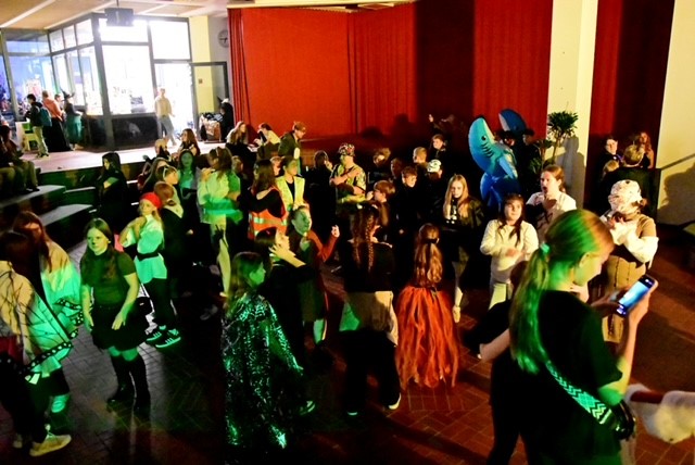 Rund um die Aula wurde passend zum Thema dekoriert: Überall hingen Spinnweben, Lichterketten und gruselige Figuren, die für eine schaurige Atmosphäre sorgten. Besonders beliebt war der Gruselkeller, der mit viel Kreativität gestaltet wurde. Dunkle Gänge, unheimliche Geräusche und plötzliche Überraschungen machten den Besuch zu einem spannenden Erlebnis.