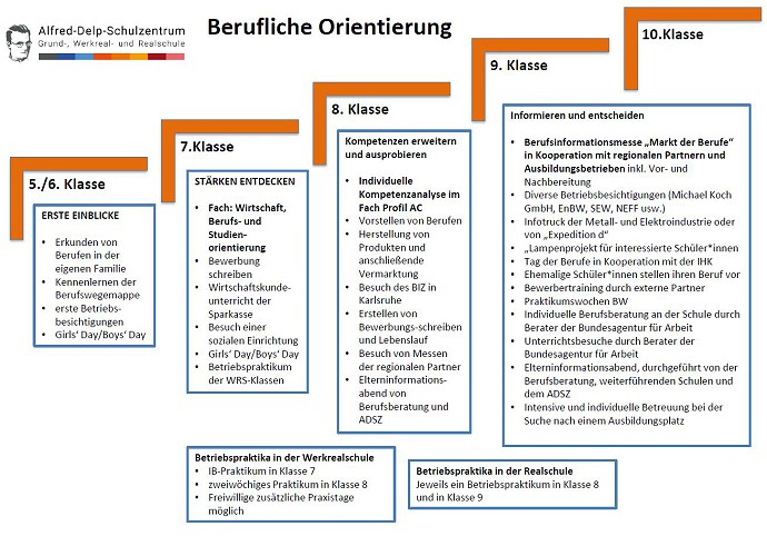 In enger Zusammenarbeit mit unseren Bildungspartnern, der Berufsberatung der Agentur für Arbeit sowie den Unternehmen / Betrieben und Behörden in Ubstadt-Weiher und Umgebung werden, insbesondere in den Klassenstufen 8 und 9, Einblicke in die Berufs- und Arbeitswelt vermittelt und Hilfen für die Berufswahl gegeben.
